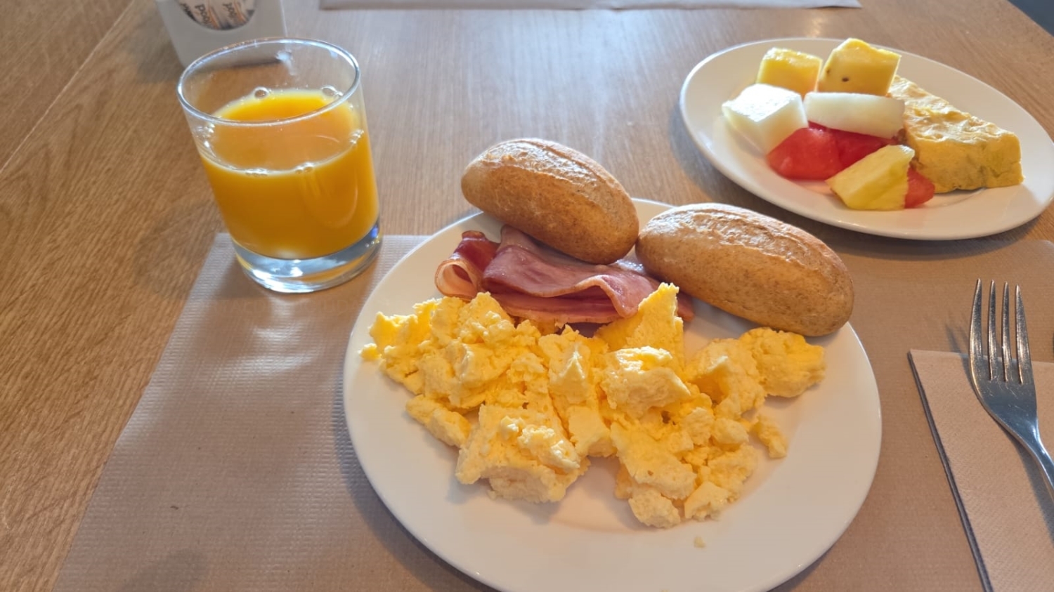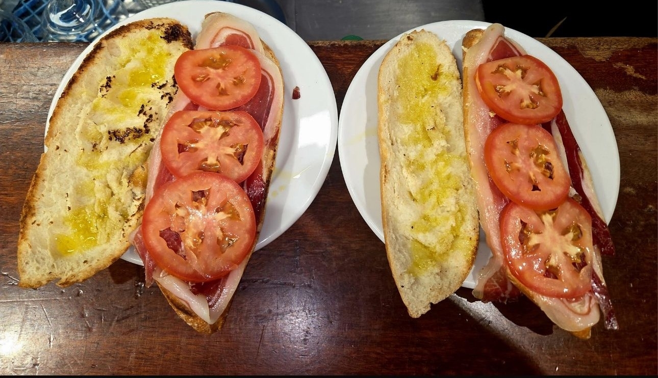 - Desayuno salado: Tosta de pan con aceite, tomate y jamón + Zumo + Café Infusión